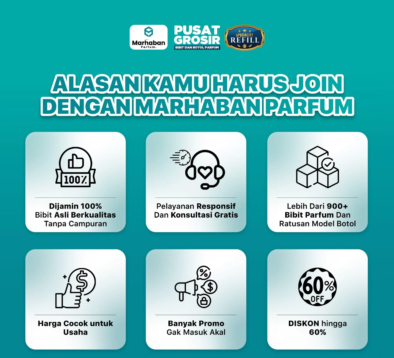 Berbagai jenis layanan yang sudah disediakan agar memudahkan dalam memulai usaha parfum. Yang pastinya kita berikan produk botol dan bibit parfum berkualitas terbaik.